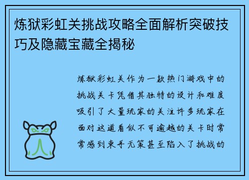 《保卫萝卜》是一款风靡一时的塔防类手游,其中“挑战模式”是一项难度较高的关卡设计,许多玩家在挑战39关时都感到颇有难度。本文将为大家提供一份详细的《保卫萝卜》挑战39关攻略,帮助玩家顺利通关。在这篇文章中,我们将从四个方面详细讲解攻略技巧,分别是:关卡特点与难点分析、塔的选择与搭配、合理布防与升级策...